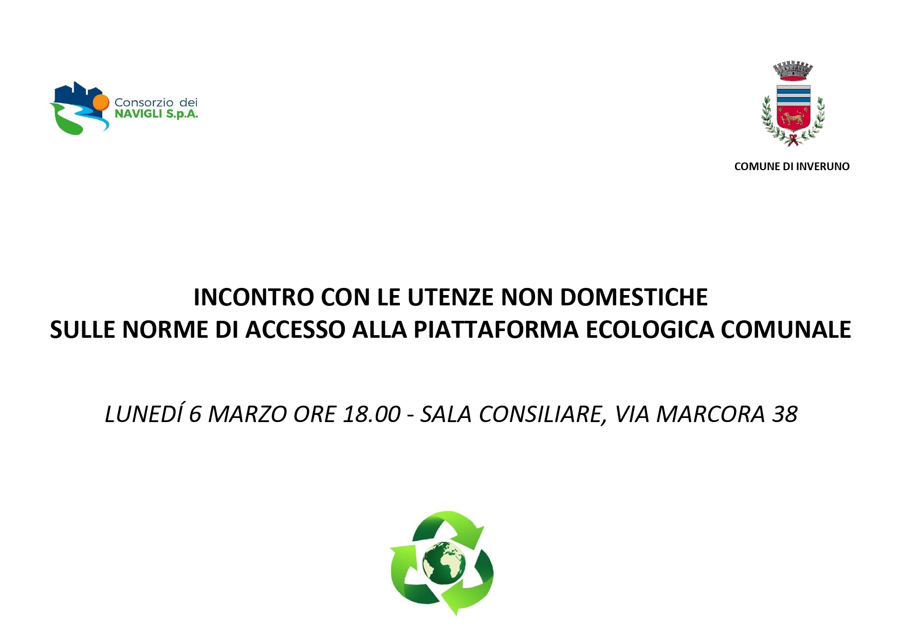 SI COMUNICA CHE IN DATA 06.03.2023 ALLE ORE 18.00 PRESSO LA SALA CONSILIARE DEL COMUNE DI INVERUNO SI TERRA’ UN INCONTRO RIVOLTO ALLE UTENZE NON DOMESTICHE IN RELAZIONE ALL’ACCESSO ALLA PIATTAFORMA ECOLOGICA.